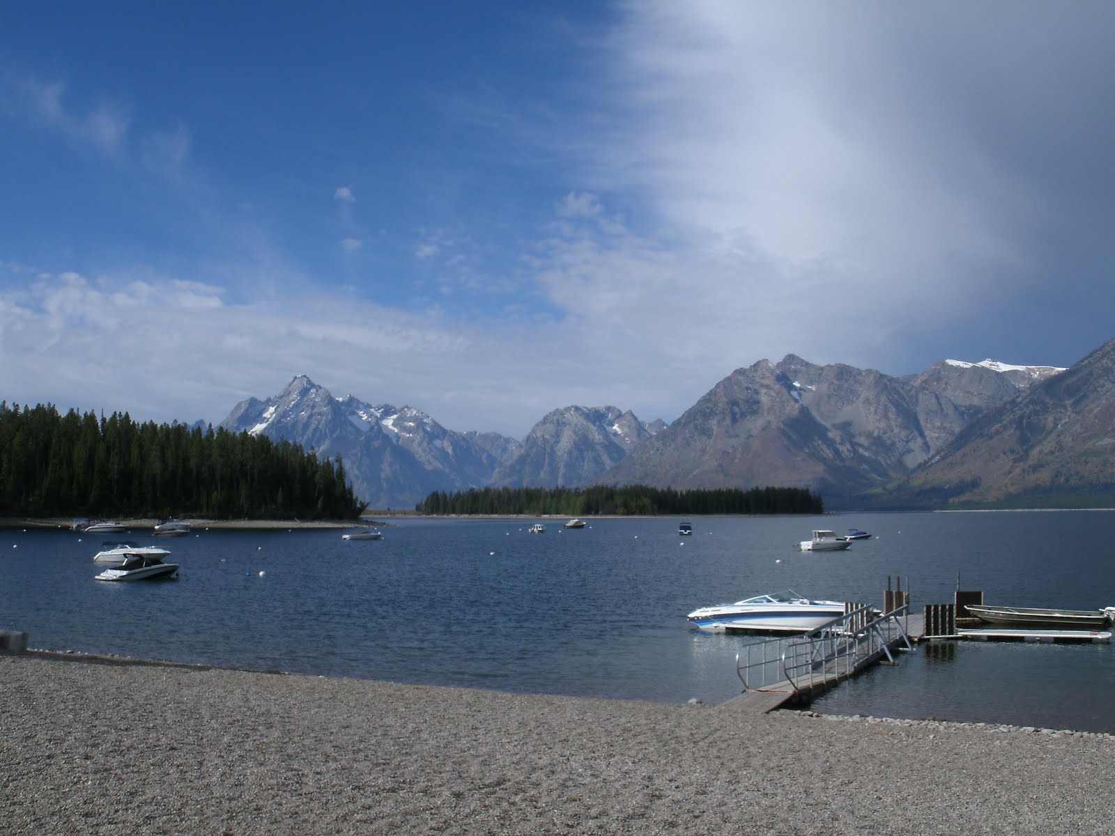 Leaving Yellowstone through the south entrance leads directly into the Grand Tetons National Park. As we drove south we first passed this huge lake. It looked as if it should have been littered with boats fishing and sailing but it was bare, just littered with beauty.